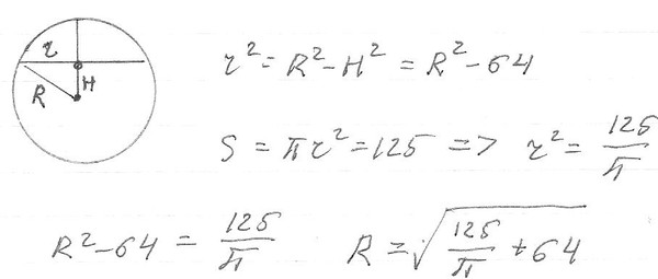 Шар пересечен плоскостью,отстоящей от его центра на 8 см. Площадь полученного сечения 125 пи см^2 .Найти радиус шара. помогиите
