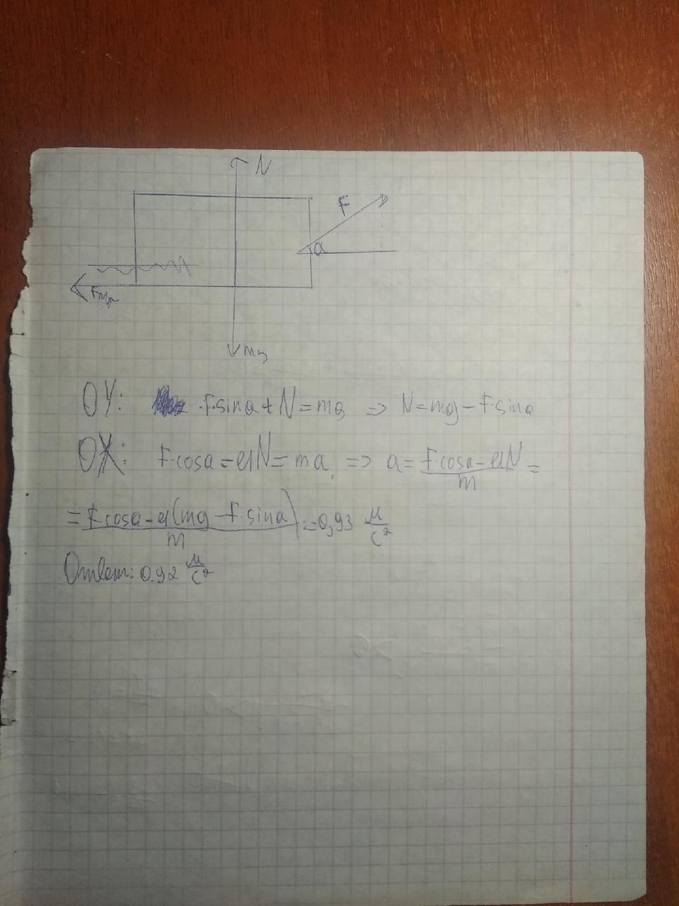 к бруску массой m = 4 кг приложена сила f = 9,8 н под углом α = 45° к горизонтальной поверхности стола. определить ускорение a движения бруска, если коэффициент трения μ = 0,1.