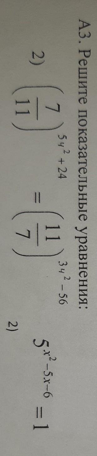 1)(\frac{7}{11})^{5x^2+24}=(\frac{11}{7} )^{3x^2-56}<=>5x^2+24=-3x^2+56<=>\\<=>8x^2=32<=>x^2=4=>x=-2,x=2\\2)5^{x^2-5x-6}=1<=>x^2-5x-6=0\\a-b+c=0=>x_1=-1,x_2=6