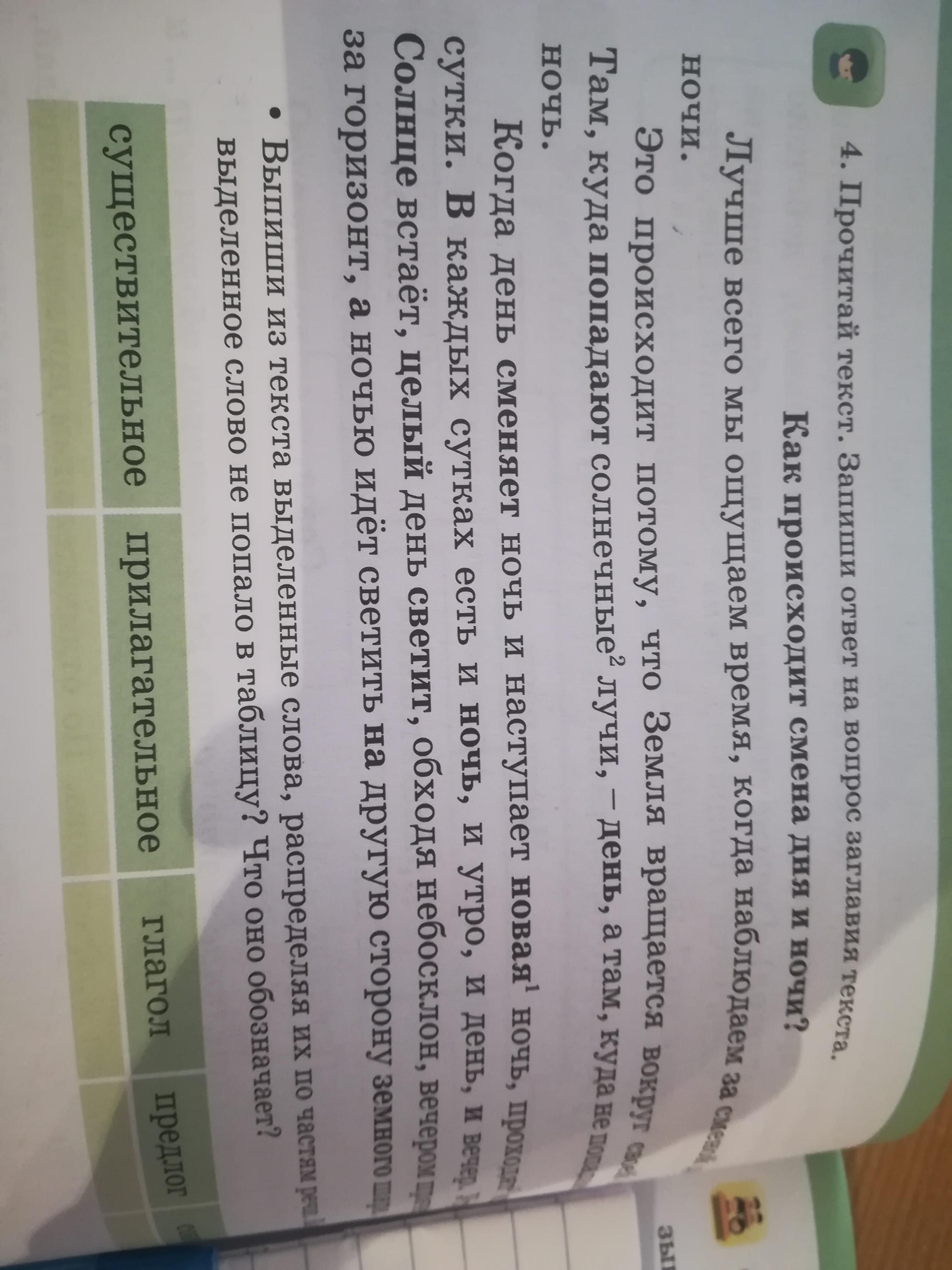 смена дня и ночи происходит потому, что из-за вращения Земли вокруг своей оси одно и то же место на земной поверхности то бывает обращено к Солнцу и освещается его лучами, то оказывается повёрнутым прочь от Солнца. Посмотрите на рис. 1, на котором солнечные лучи падают на земной шар слева. Благодаря этому на левой, освещенной солнечными лучами половине земного шара — день, а на правой, неосвещённой половине — ночь.