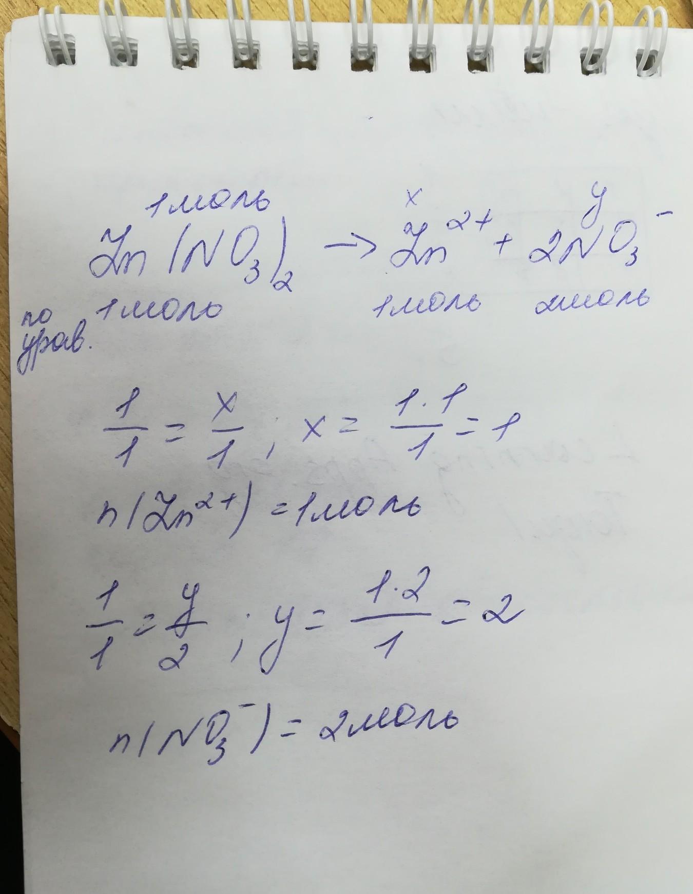 Определть сколько моль ионов металла и кислотного остатка образуется при диссоциации 1 моль нитрата цинка СЛЕДУЕТ ПИСАТЬ ТАК: Zn (NO3)2 = Zn(2+) + 2NO3(-)