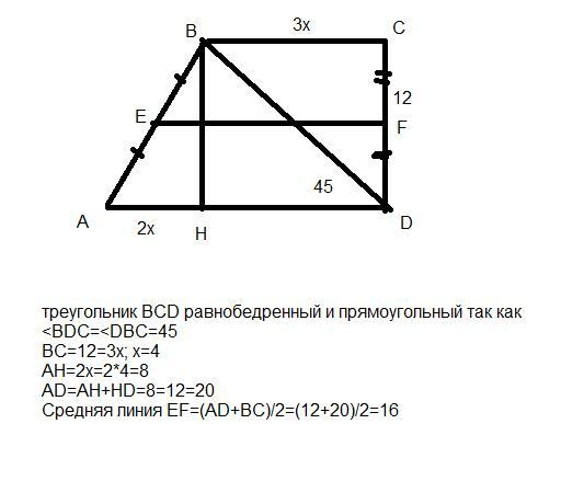 Добрые люди помогите с решением данной задачи. Дана прямоугольная трапеция ABCD, ∠C = ∠D = 90°, CD = 12см, ∠ADB = 45°, BH - высота, BC : AH = 3:2. Найдите среднюю линию трапеции.