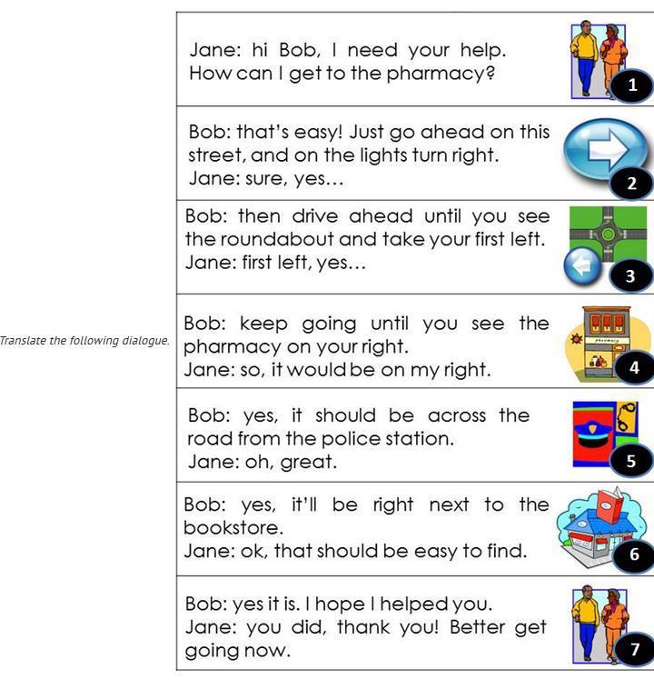 Джейн: Привет, Боб, мне нужна твоя помощь. Как пройти в аптеку?