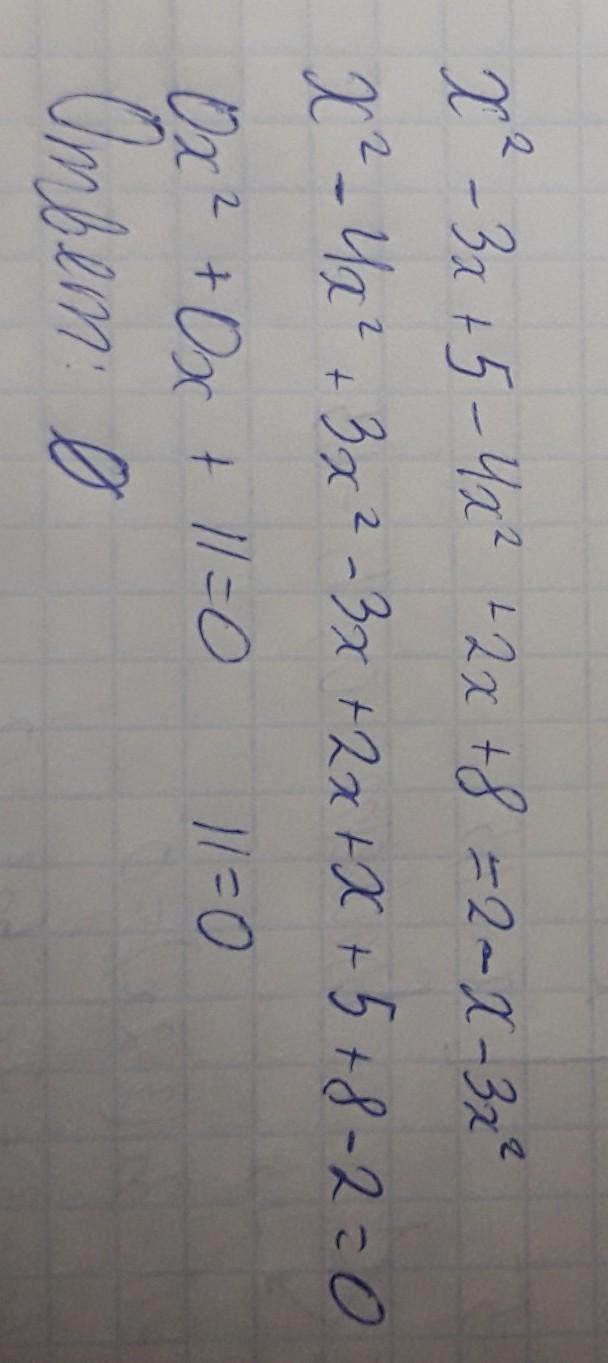 х в квадрате - 3х + 5 - 4х в квадрате + 2х + 8 = 2 - х - 3х в квадрате. кто поможет? большое спасибо заранее