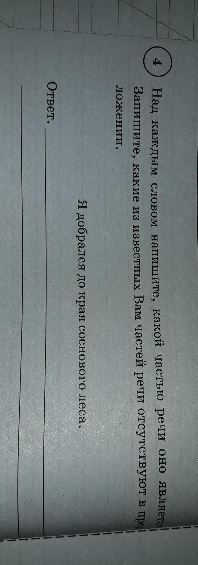 Ответ: я-местоимение, добрался-глагол, до-предлог, края-существительное, соснового-прилагательное, леса-существительное.