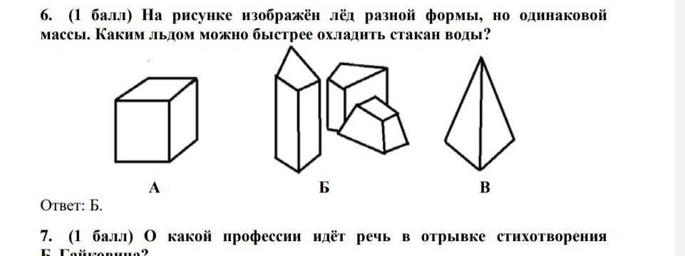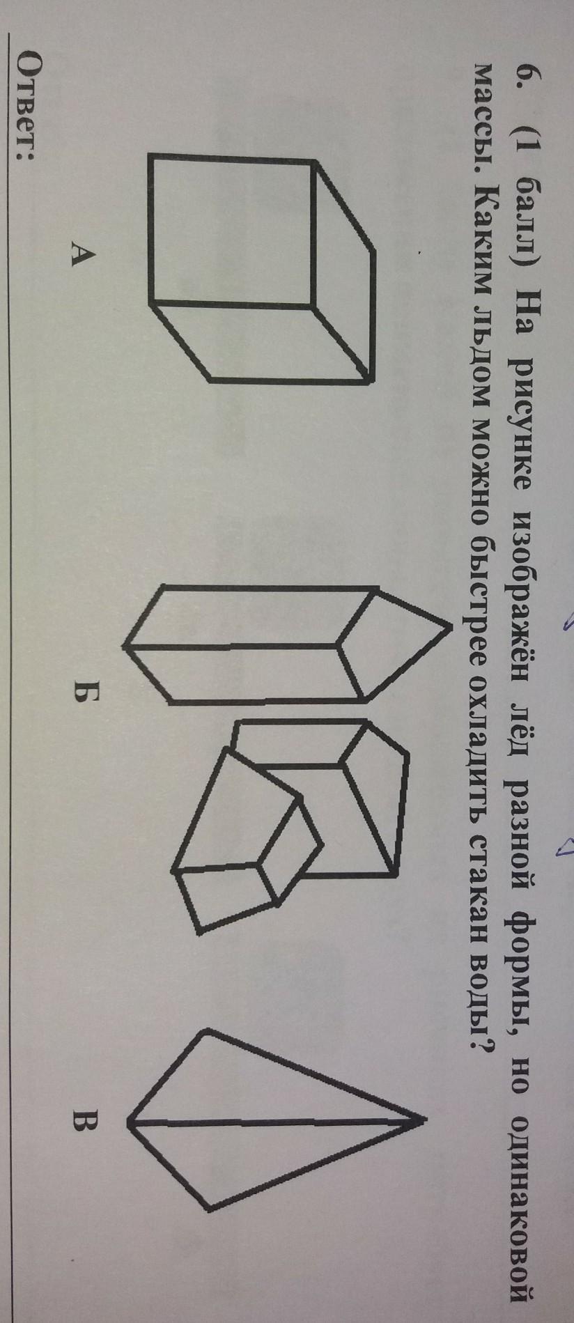 На рисунке изображен лёд разной формы, но одинаковой массы. Каким льдом можно быстрее охладить стакан Воды?
