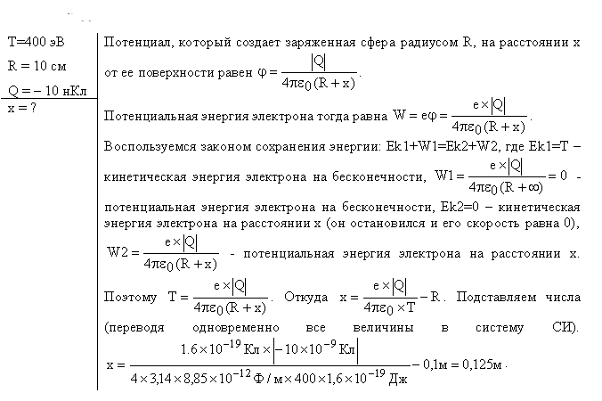 Электрон с энергией W = 400 эВ (в бесконечности) движется вдоль силовой линии по направлению к поверхности металлической заряженной сферы радиусом R= 10 см. Определить минимальное расстояние а, на которое приблизится электрон к поверхности сферы, если заряд ее q = -10 нКл.