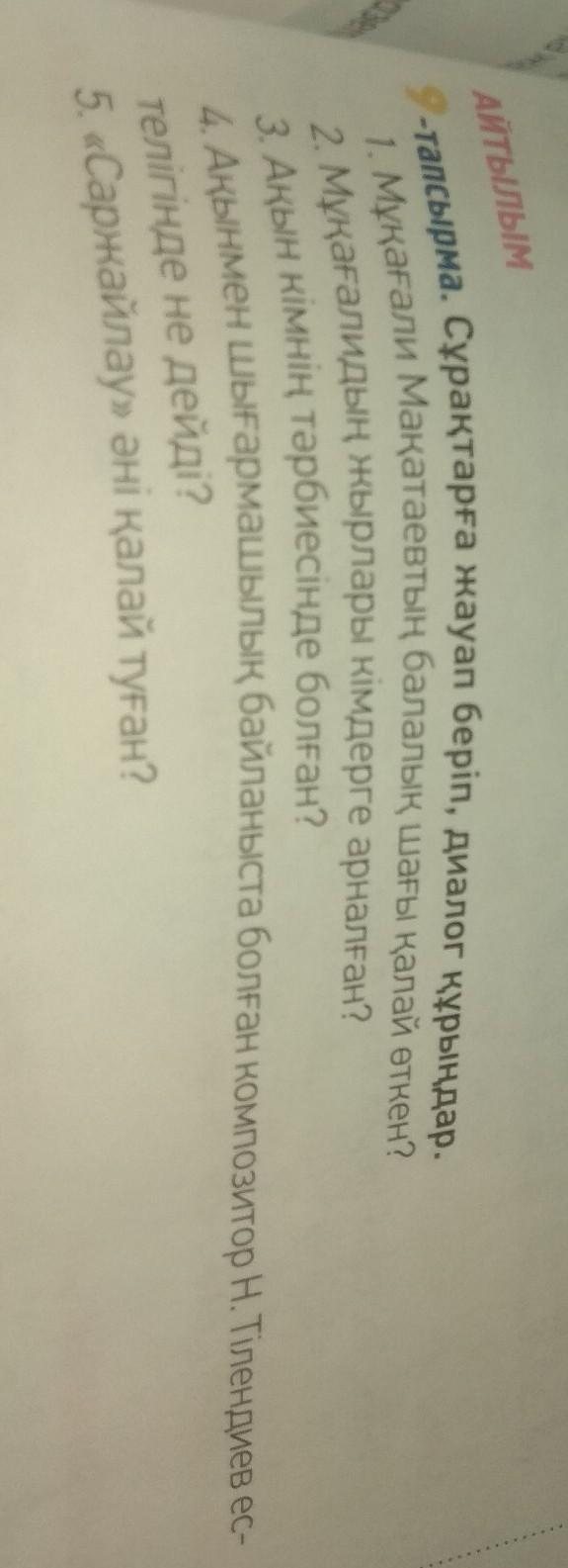Отвечая на вопросы о диалоге. 1. Как прошло детство Мукагали Макатаева? Кто такие стихи из Книги Мукагали? 3. Кого воспитал поэт? 4. Композитор с творческой работой с поэтом Что говорит Тлендиев в своей памяти? 5. Как родилась песня "Sarzhailau"?