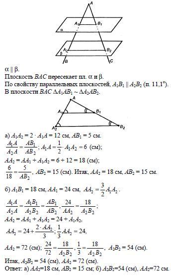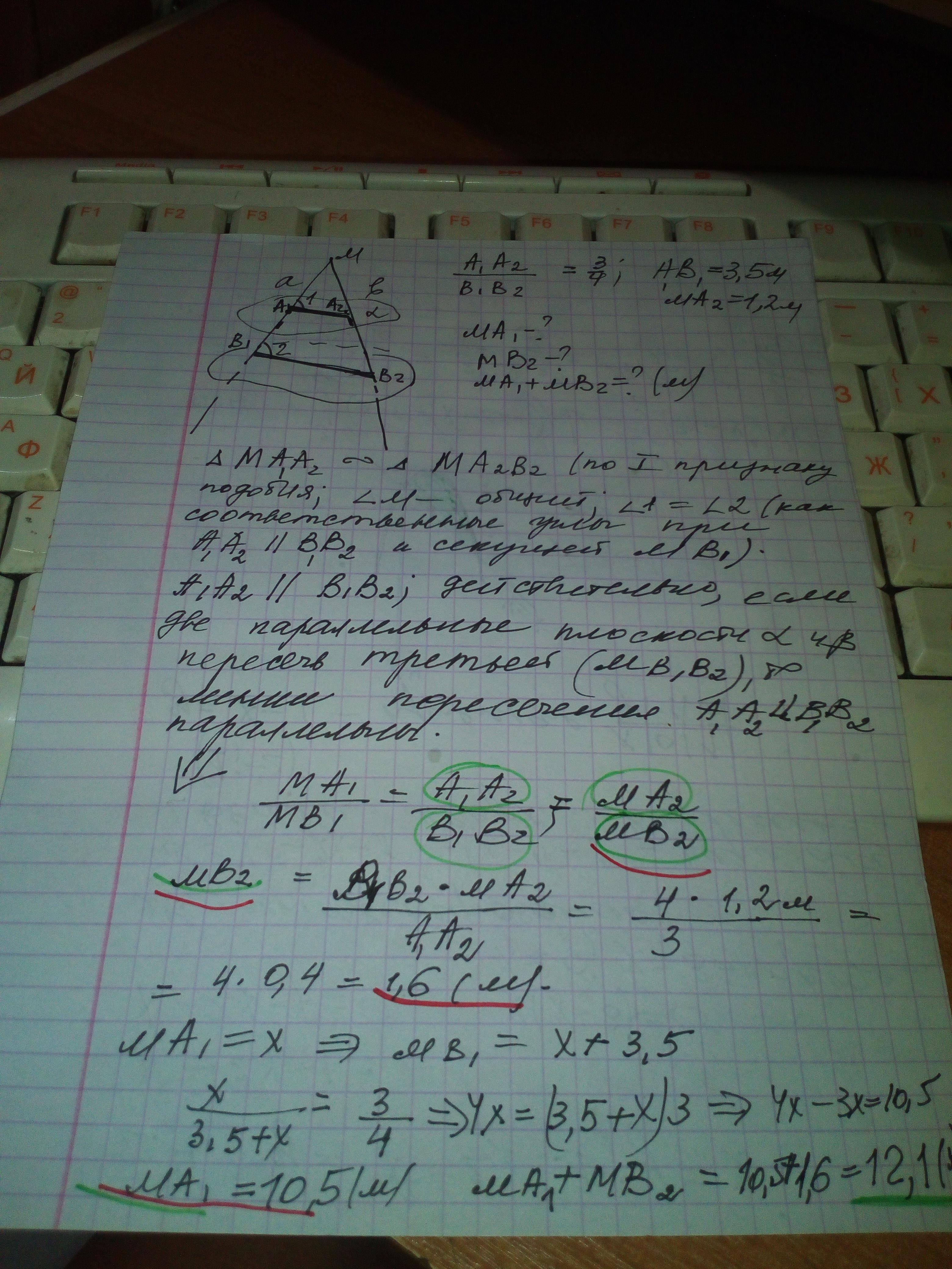 Через точку M проведены две прямые а и b, которые пересекают две параллельные плоскости α и β. Первую в точках A1 и A2, вторую в точках B1 и B2. Найдите MA1 и MB2, если A1A2:B1B2=3:4,A1B1=3,5м, MA2=1,2м. В ответ запишите сумму длин сторон MA1 и MB2 в метрах.