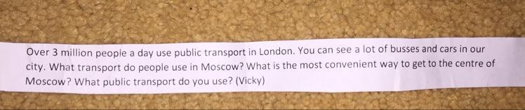 Более 3 миллионов человек ежедневно пользуются общественным транспортом в Лондоне. Вы можете увидеть много автобусов и автомобилей в нашем городе. Каким транспортом пользуются люди в Москве? Какой самый удобный способ добраться до центра Москвы? Какой общественный транспорт вы используете?