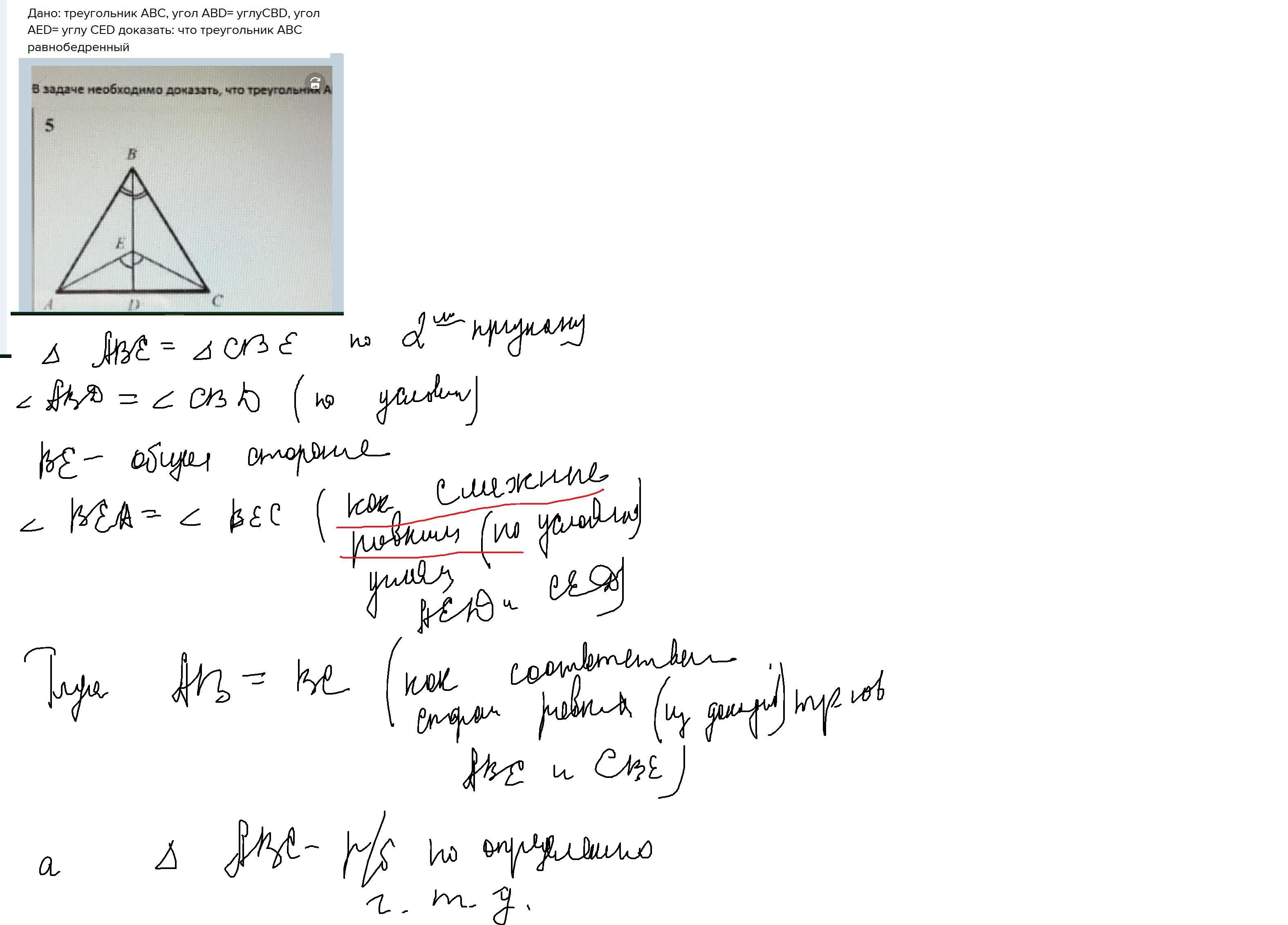 Дано: треугольник АВС, угол АBD= углуCBD, угол AED= углу CED доказать: что треугольник ABC равнобедренный