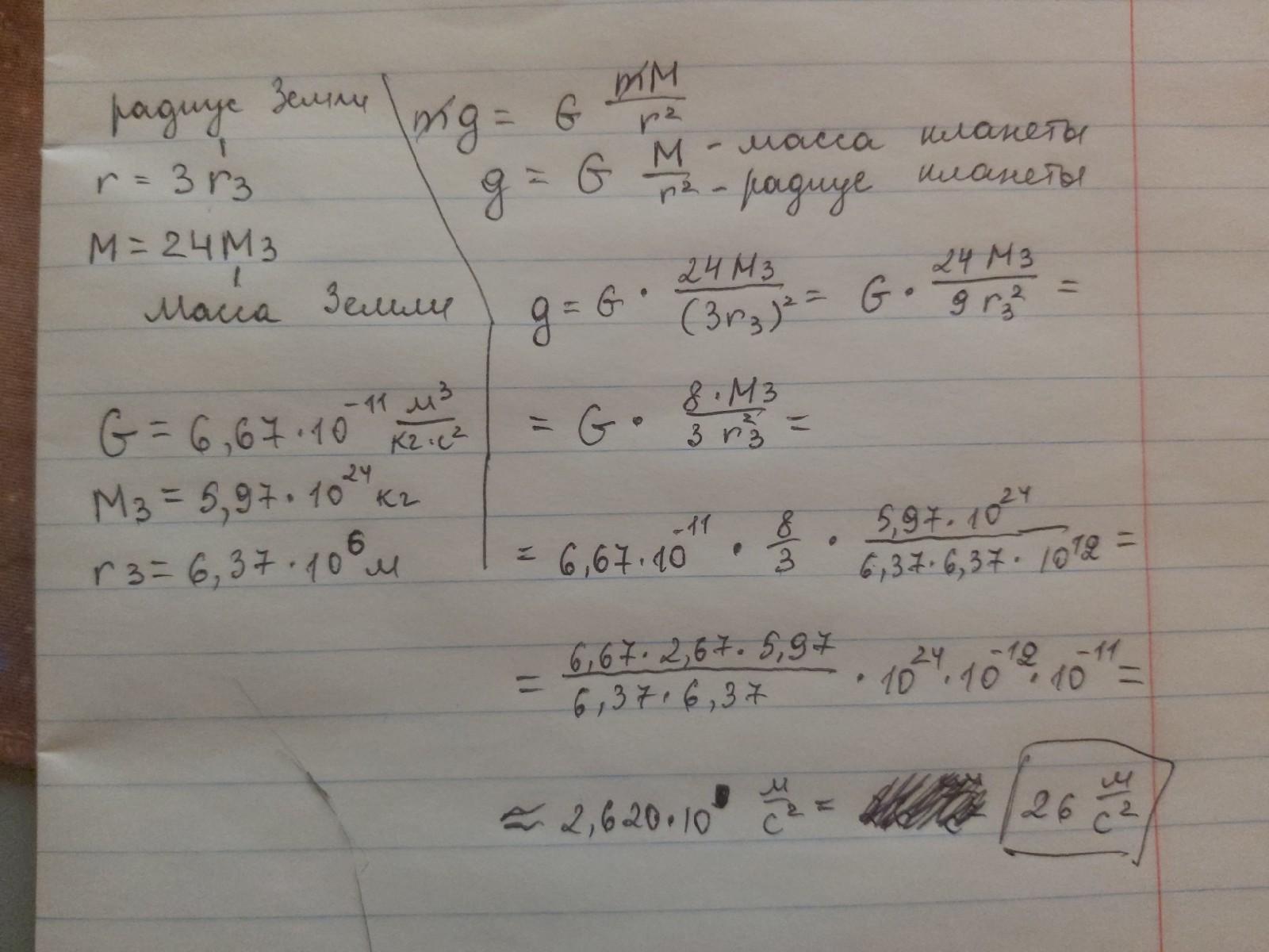 Каково ускорение свободного падения на планете, радиус которой в 3 раза больше радиуса Земли, а масса– в 24 раза больше массы Земли? Считайте что планета не вращается.