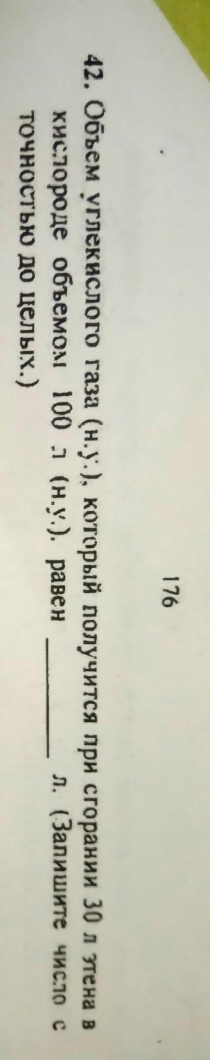 Следовательно для сгорания 30 литров этена понадобится 90 литров кислорода, получится 60 литров углекислого газа, ОТВЕТ: 60 литров углекислого газа