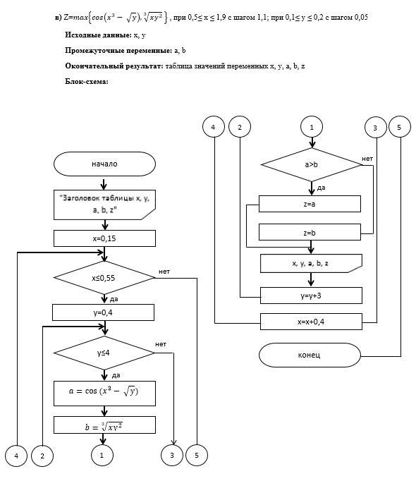 Числа в блок-схеме не соответствуют ограничениям "0.5<=x<=1.9 с шагом 1.1; 0.1<=y<=0.2 с шагом 0.05". Она приведена в качестве примера? Типа подставить свои значения.