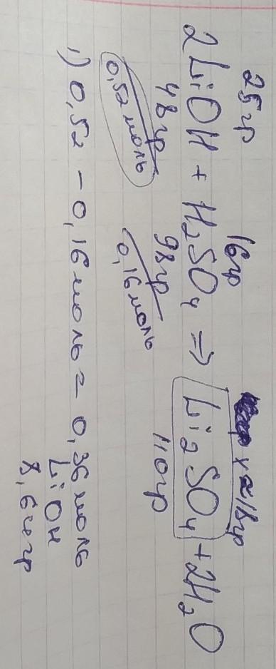 25 грамм lioh соединяется с 16 граммами h2so4. найти избыток одного из веществ и массу получившейся соли