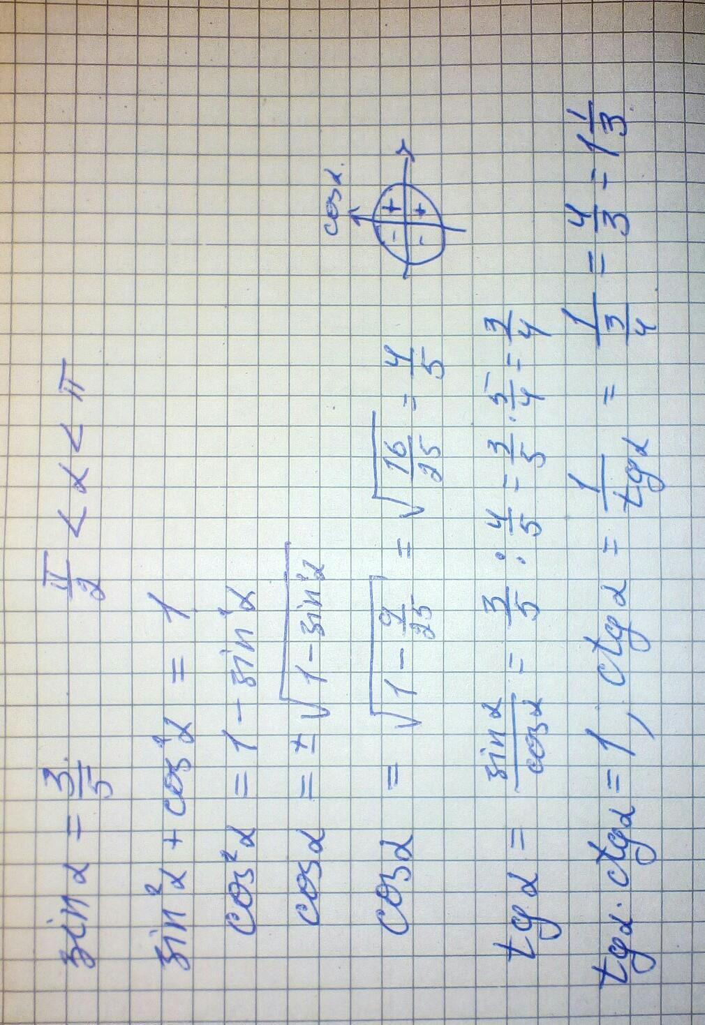 Плиз,вычислите значение каждой из тригонометрических функций,если sin a= 3/5 и п/2 <а<п