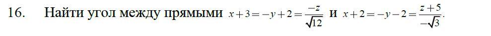 тогда угол между прямыми равен углу между направляющими векторами. Вычислю его через скалярное произведение этих векторов