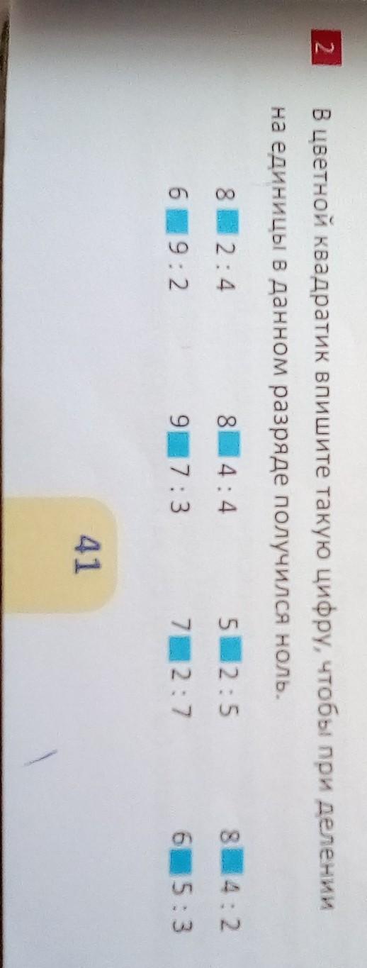 В цветной квадратик впишите такую цифру чтобы при делении на еденицы в данном разряде поличился ноль.