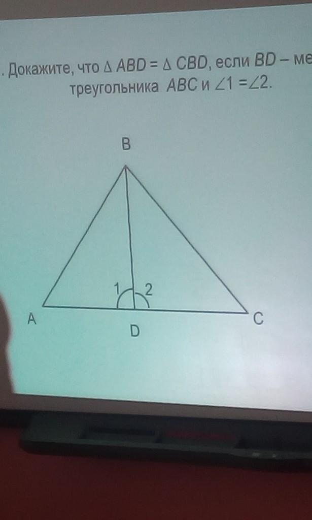 Докажите что треугольник abd равен треугольнику cbd если BD медиана треугольника ABC и угол 1 равен угол 2