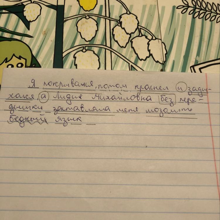 Я(подлеж.) покрывался(сказ.), потом(обст.) краснел(сказ.) и задыхался(сказ.), а Лидия Михайловна(подлеж.) без передышки(дополн.) заставляла(сказ.) меня(дополн.) мозолить(сказ. относящ. к заставляла) бедный(опред.) язык(дополн.). (повествовательное, невосклицательное, сложное, сочинительное, с однородными членами)