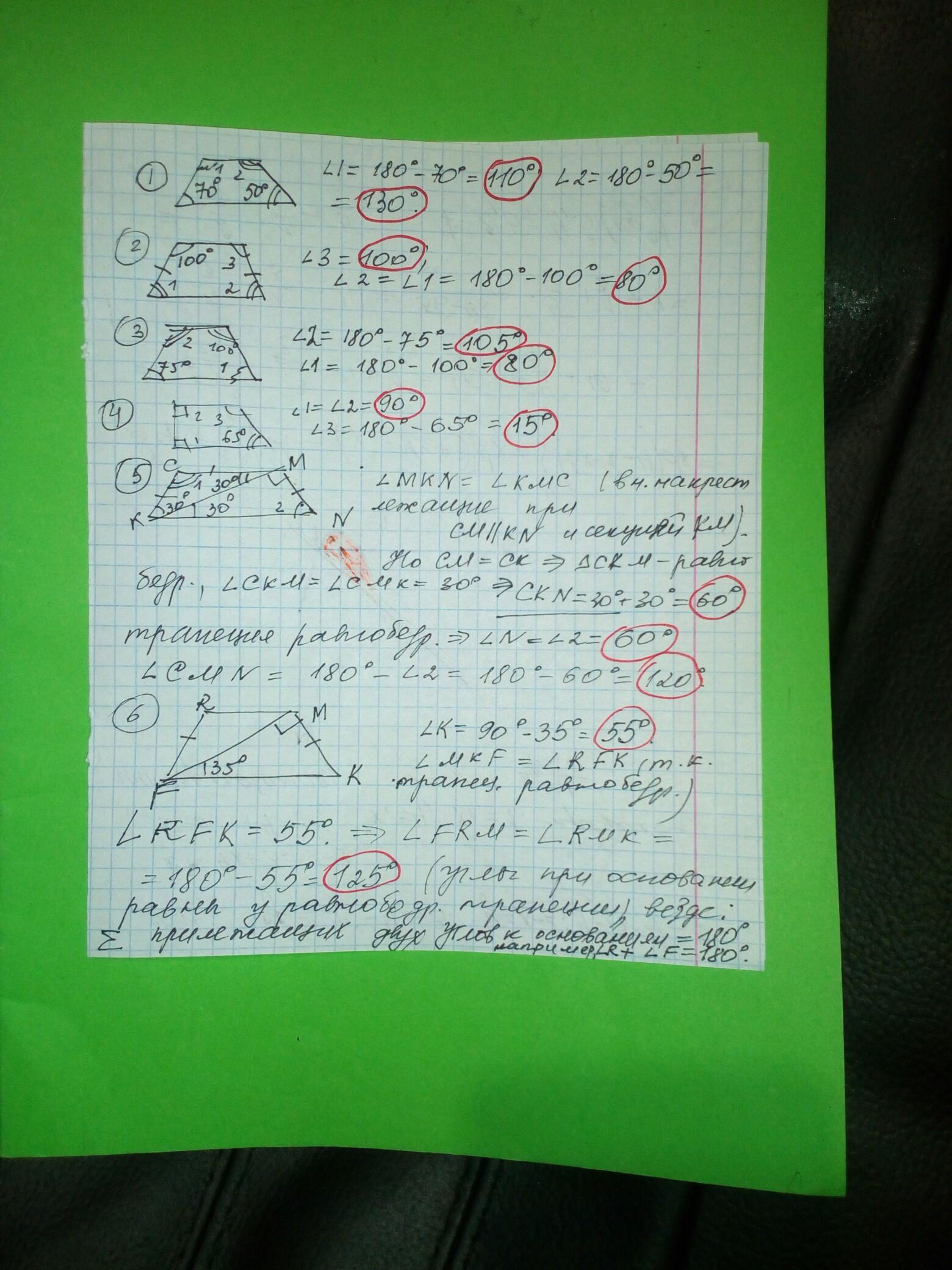 5. ∠MKN=30°, ∠CMK=30° как внутренние накрест лежащие при СМ║КN и секущей КМ, ∠СКМ=30°, ∠СКN=30+30=60°, ∠КNМ=60° т.к. трапеция равнобедренная;