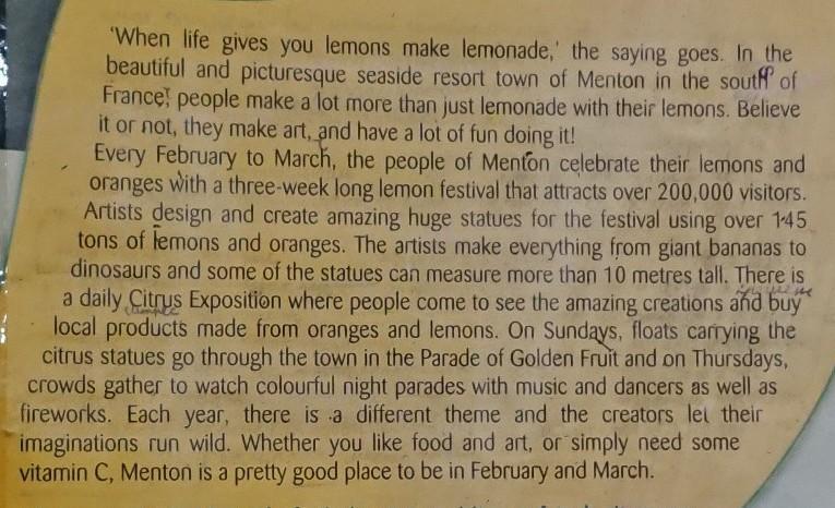 Кожного лютого по березень люди Менфона відзначають свої лимони та апельсини тритижневим фестивалем лимона, який приваблює понад 200 000 відвідувачів. Художники проектують та створюють дивовижні величезні статуї для фестивалю, використовуючи понад 145 тонн лимонів та апельсинів. Художники роблять все - від гігантських бананів до динозаврів, а деякі статуї можуть бути розміром понад 10 метрів у висоту. Є щоденна виставка цитрусових, куди люди приходять, щоб побачити дивовижні творіння та придбати місцеві продукти з апельсинів та лимонів. У неділю поплавці, що несуть цитрусові статуї, проходять через місто в Параді золотих фруктів, а по четвергах натовпи збираються, щоб спостерігати барвисті нічні паради з музикою та танцюристами, а також....
