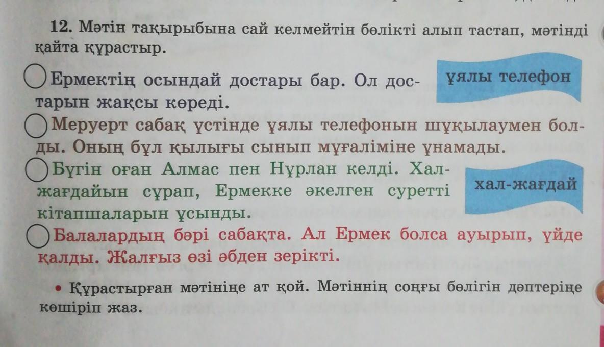 Балалардың бәрі сабақта. Ал Ермек болса ауырып, үйде қалды. Жалғыз өзі әбден зерікті. Бүгін оған Алмас пен Нұрлан келді. Хал-жағдайын сұрап, Ермекке әкелген суретті кітапшаларын ұсынды. Ермектің осындай достары бар. Ол достарын жақсы көреді.