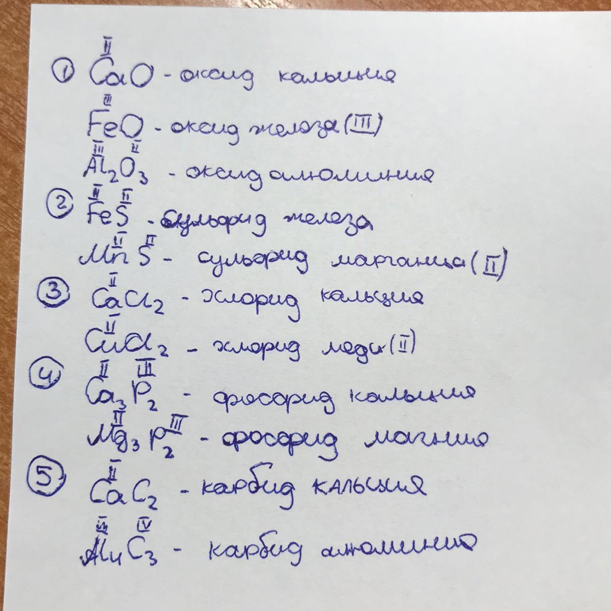 записать формулы, проставить валентность и дать названия следующим самостоятельно составленным веществам: 2 оксида, 2 сульфида, 2 хлорида, 2 фосфида, 2 карбида.