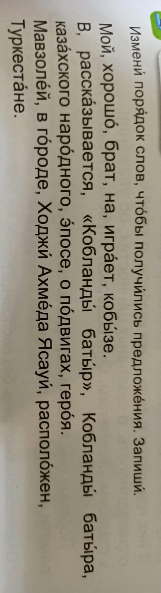 Мой брат хорошо играет на кобызе. В "Кобланды батыр" рассказывается о эпохе подвигах казахского героя Кобланды батыра. Мавзолей расположение в городе Туркестане, Ходжи Ахмеда Ясауи.