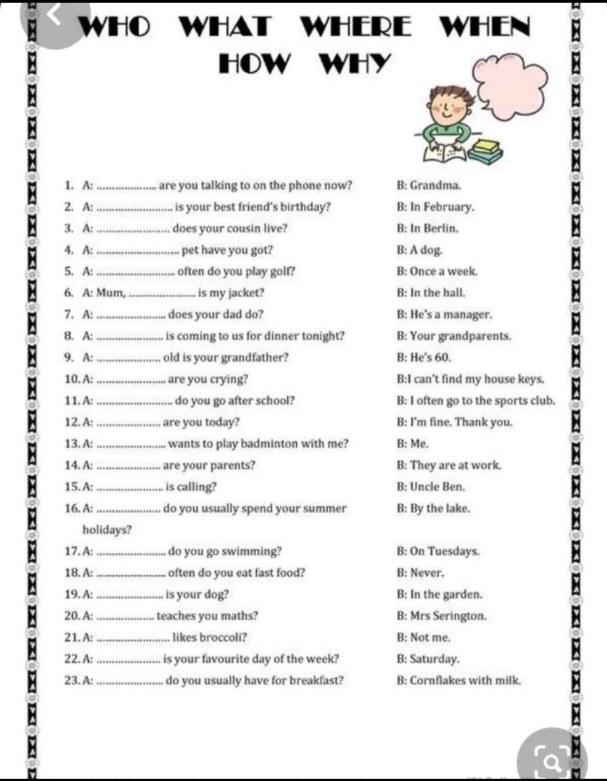 Твоя задача в том, что нужно вставить пропущенные вопросительные слова, которые написаны над заданиями.