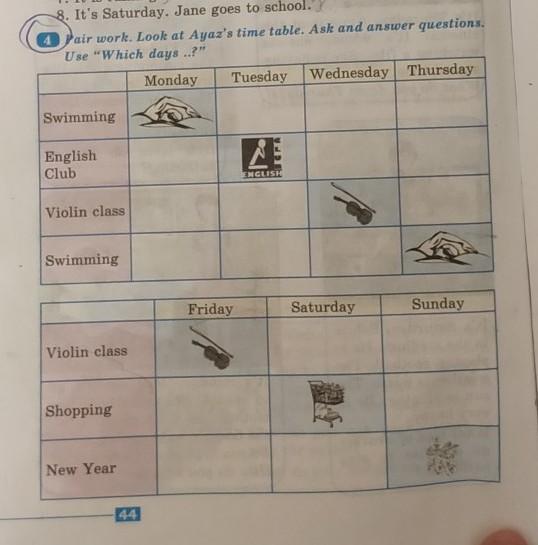 в этом упражнении нужно использовать слово which days.И сделать вопросы какие дни плавает AYAZ. какие дни AYAZ ходит в анг.клуб. какие дни AYAZ ходит в музыкальную школу. какие дни ходит в магазин. и когда новый год.