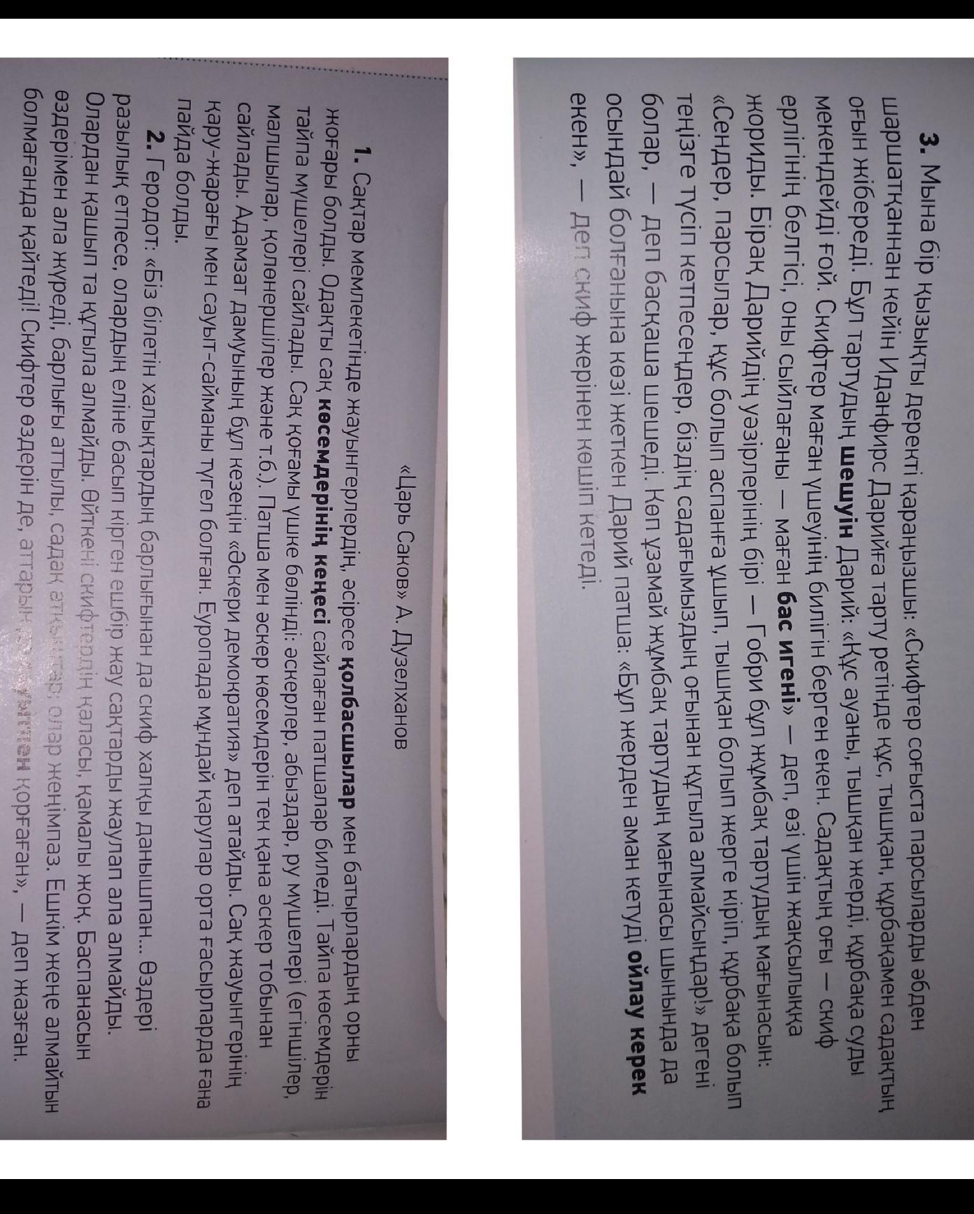 Посмотрите на один интересный документ: "скифы после того, как в боях парсы сильно утомляли, отправляют Иданфирсу Дарию птицу, мышку, подбежку из лука. Дарий, решив эту лепту, сказал: «Зов обитает воздух, мышь, подруга-вода. Скифы дали мне власть трех. Лук, поясные бляшки патрона - знак подвига, его концерт - главный игені мне, что <url>-лучшее для себя. Но одно из главных из них Дария-Гобри смысл этой загадки: "если вы, парсы, птица, летите в небо, мышь, заходите на землю, не попадаете в море, вы не можете избавиться от стульев нашего соседа! и, наверное, решится по - другому. Вскоре царь Дарий, убедившись, что таинственное значение действительно было таковым, сказал: «надо думать, что выжить здесь», - переехал из скифской земли. А.» Царь Саков " Д. Дузелханов 1. в государстве саков было велико место воинов, особенно полководцев и батыров. Союз станцевали царицы, избравшие советом Саранцев. Вожди племени избрали членами племен. Общество саков было разделено на три: войска, жузы, члены рода (земледельцы. скотоводы, коленеристы и др.). Вождь царя и вождя аснера избрали лишь из армейской группы. Этот период развития человечества называют "военной демократией". Само воина вооружение и броня инструмент весь в наличии. В Европе такое оружие появилось только в Средние века. 2. Геродот: "от всех народов, которые мы знаем, скифский народ гениальный... ни один враг не может захватить саков, вторгшихся в их страну, если они не разочарованы. Они не могут сбежать и избежать, потому что нет Напы, крепости. Уютные при себе, все ушли, вещи: они победители. Никто не может побеждать! Скифы защищали ни себя, ни названия», - написал,