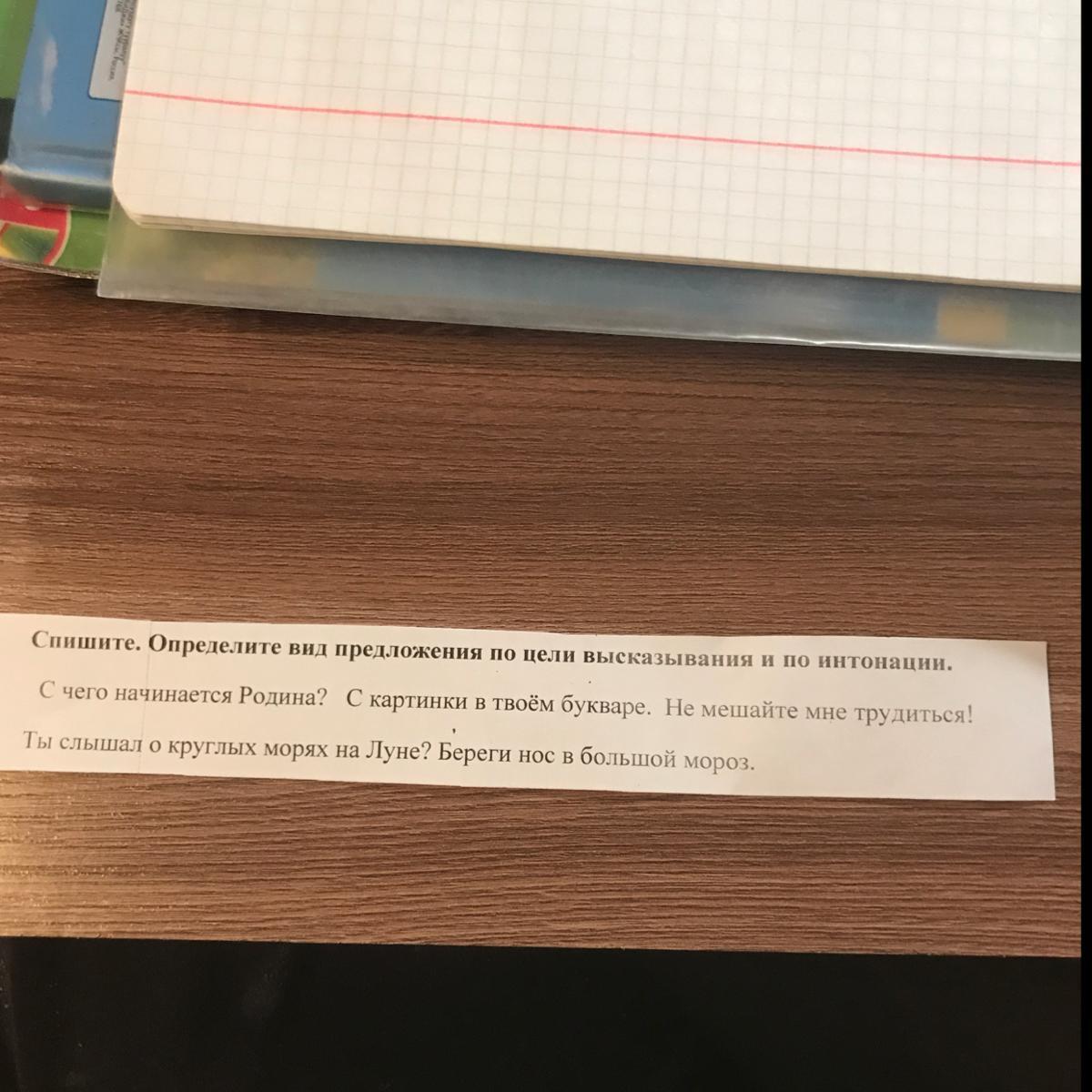 С чего начинается Родина? - вопросительное,невосклицательное. С картинки в твоем букваре. - повествовательное, невосклицательное. Не мешайте мне трудиться! - побудительное, восклицательное. Ты слышал о круглых морях на Луне? - вопросительное, невосклицательное. Береги нос в большой мороз. - побудительное, невосклицательное.