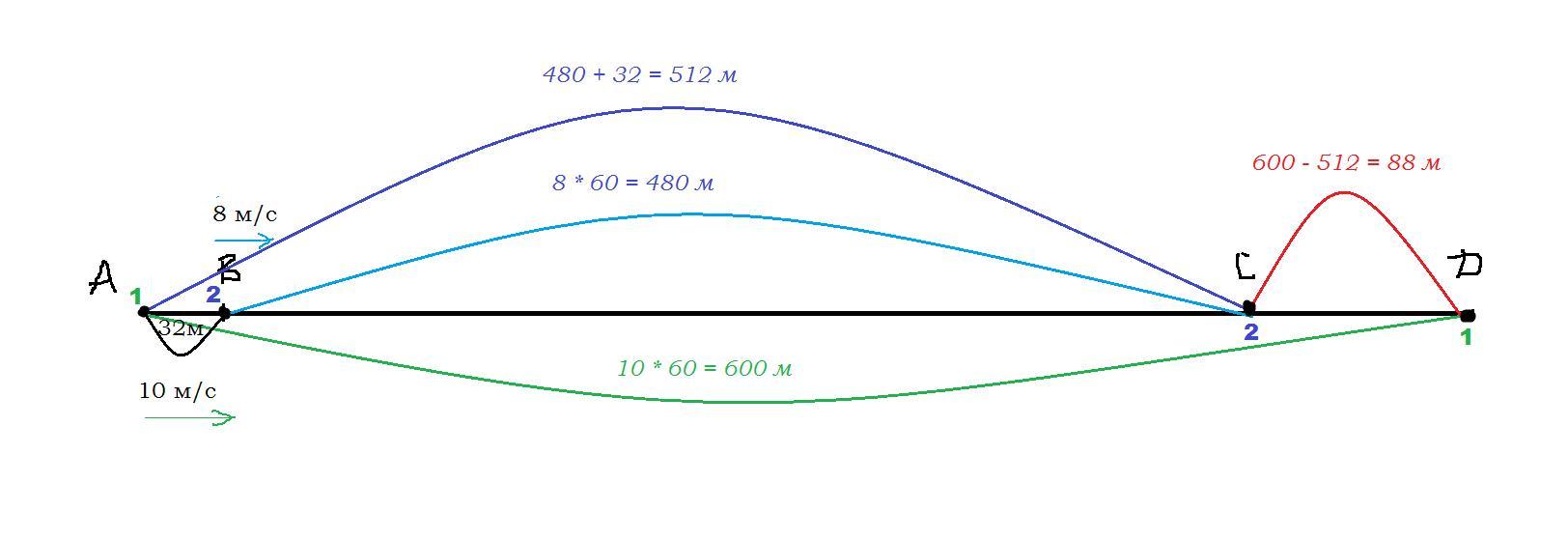 ДВА ЗАЙЦЫ ПОБЕЖАЛИ ОДНОВРЕМЕННО ПО ПРЯМОЙ АБ В ОДНОМ НАПРАВЛЕНИИ ОДИН ОТ КОЧКИ А ДРУГОЙ ОТ КОЧКИ Б СКОРОСТЬ БЕГУЩЕГО В ПЕРЕДИ 8 М/С СКОРОСТЬ ЗАЙЦА БЕГУЩЕГО СЛЕДОМ 10 М/С РАСТОЯНИЕ МЕЖДУ КОЧКАМИ 32 М НА КАКОМ РАСТОЯНИЕ БУДУТ ЗАЙЦЫ ЧЕРЕЗ ОДНУ МИНУТУ