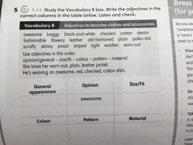 Vocabulary B Adjectives to describe clothes and accessories