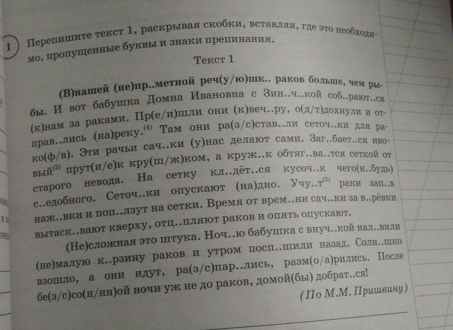(В)нашей (не)пр..метной реч(у/ю)школу.. раков больше, чем рыбы. И вот бабушка Домна Ивановна с Зин..ч..кой соб..рают..ся (к)нам за раками. Пр(е/и)шли они (к)веч..ру, о(д/т)дохнули и отправ..лись (на)реку. Там они ра(з/с)став..ли сеточки для рако(ф/в). Эти рачьи сачки (у)нас делают сами. Заг..бает..ся ивовый прут(и/е)к кру(ш/ж)ком, а круж..к обтяг..ва..тся сеткой от старого невода. На сетку кл..дёт..ся кусоч..к чего(н..будь) с..едобного. Сеточки опускают (на)дно. Учу..т раки зап..х наж..вки и поп..лзут на сетки. Время от врем..ни сачки за в..рёвки вытаск..вают кверху, отц..пляют раков и опять опускают.