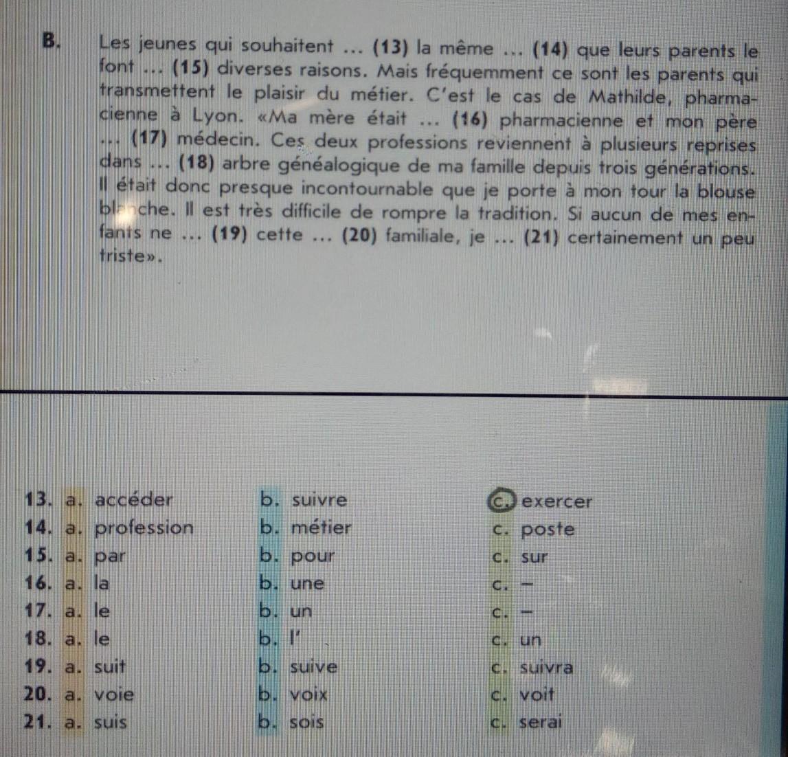 transmettent le plaisir du métier. C'est le cas de Mathilde, pharmacienne à Lyon. «Ma mère était ... (16) pharmacienne et mon père ... (17) médecin. Ces deux professions reviennent à plusieurs reprises