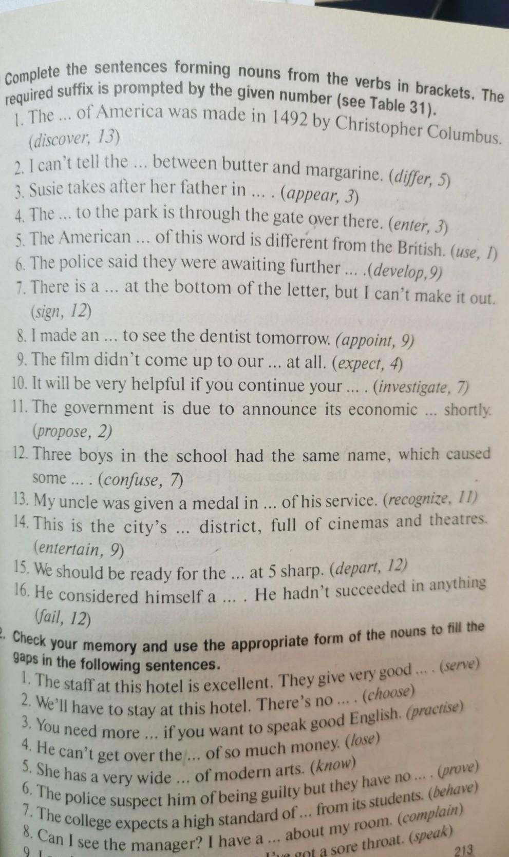 Ответ: 1 discovery 2 difference 3 appearance 4 entrance 5 usage 6 development 7 signature 8 appointment 9 expectation(s) 10 investigation 11 proposal 12 confusion 13 recognition 14 entertainment 15 departure 16 failure