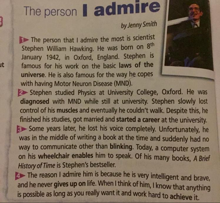 Больше всего я восхищаюсь ученым Стивеном Уильямом Хокингом. Он родился 8 января 1942 года в Оксфорде, Англия. Стивен известен своими работами по основным законам Вселенной. Он также известен тем, как он справляется с наличием болезни двигательных нейронов (БДН). 2 Стивен изучал физику в Университетском колледже Оксфорда. Он был диагностирован с БДН еще в университете. Стивен медленно терял контроль над своими мышцами и в конце концов не мог ходить. Несмотря на это, он закончил учебу, женился и начал карьеру в университете. Несколько лет спустя он совсем потерял голос. К сожалению, в то время он был в середине написания книги и не мог общаться никаким другим способом кроме моргания. Сегодня компьютерная система на его инвалидном кресле позволяет ему говорить. Из его многочисленных книг "Краткая история времени" -бестселлер Стивена. 4 причина, по которой я восхищаюсь им, заключается в том, что он очень умен и храбр, и он никогда не отказывается от жизни. Когда я думаю о нем, я знаю, что все возможно, пока вы действительно этого хотите и упорно трудитесь, чтобы достичь этого.