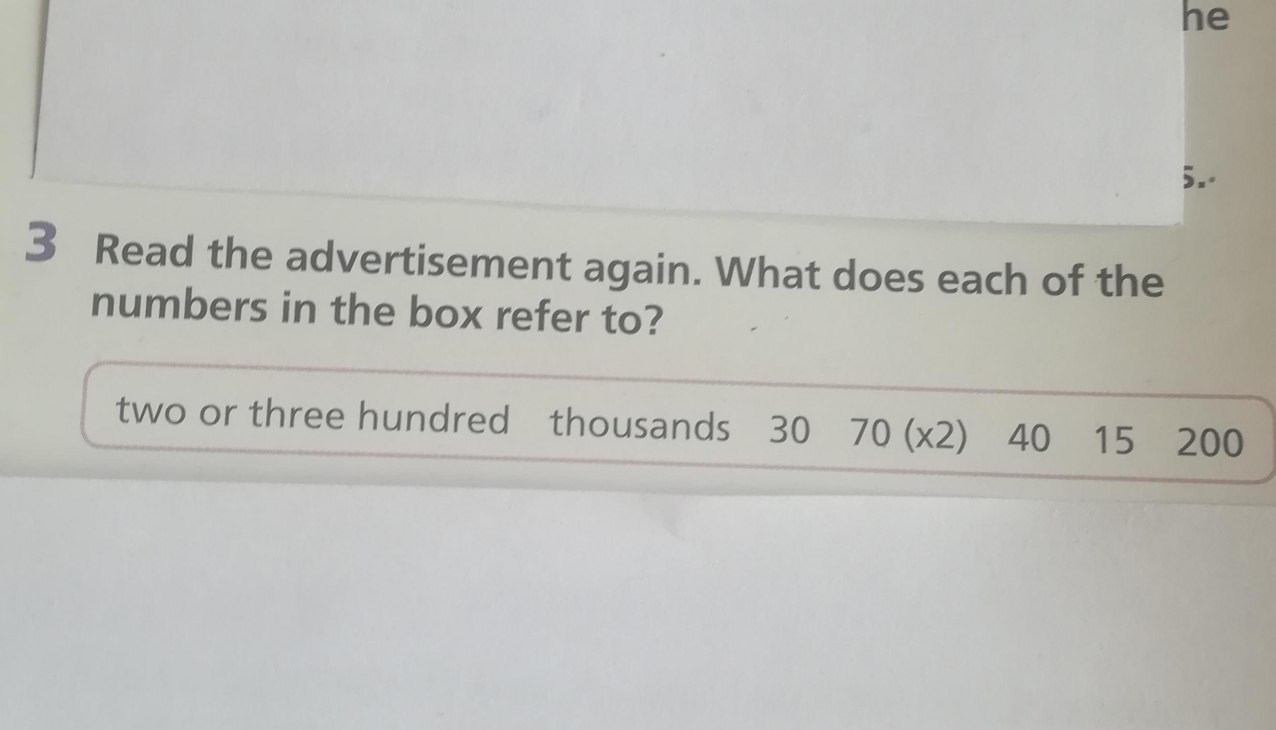 сделай задание прочитайте рекламу ещё раз. На что ссылается каждый номер в поле?Two or three hundred thousands 30 70(×2) 40 15 200