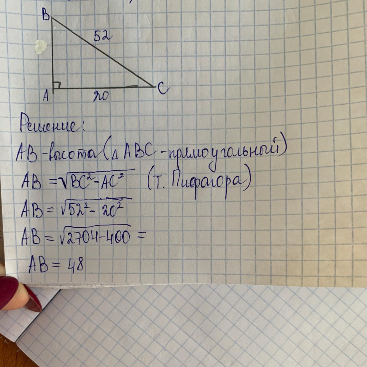20Б.Катет и гипотенуза прямоугольного треугольника равны 20 и 52. Найдите высоту,