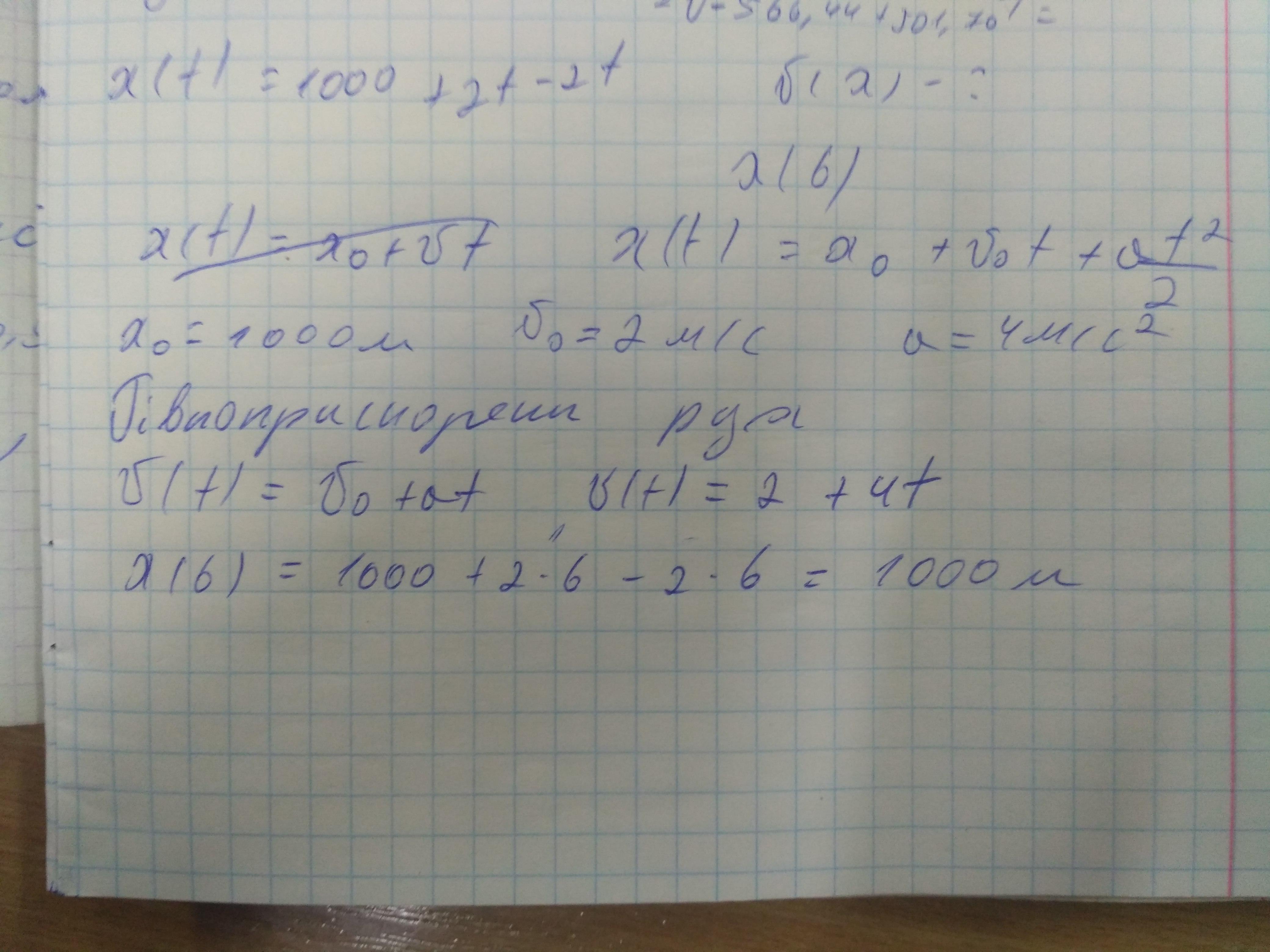 Рівняння руху матеріальної точки має вигляд x(t) =1000+2t-2t(м). Визначити параметри руху та записати рівняння швидкості Vx(t), визначити координату, швидкість та шляху через 6 с руху.