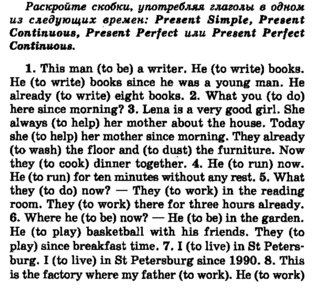 1. This man is a writer. He writes books. He has been writing books since he was a young man. He has already written eight books. 2. What have you been doing here since morning? 3. Lena is a very good girl. She always helps her mother about the house. Today she has been helping her mother since morning. They have already washed the floor and dusted the furniture. Now they are cooking dinner together. 4. He is running now. He has been running for ten minutes without any rest. 5. What are they doing now? — They are working in the reading room. They have been working there for three hours already. 6. Where is he now? — He is in the garden. He is playing volleyball with his friends. They have been playing since breakfast time. 7. I live in St. Petersburg. I have been living in St. Petersburg since 1990. 8. This is the factory where my father works.