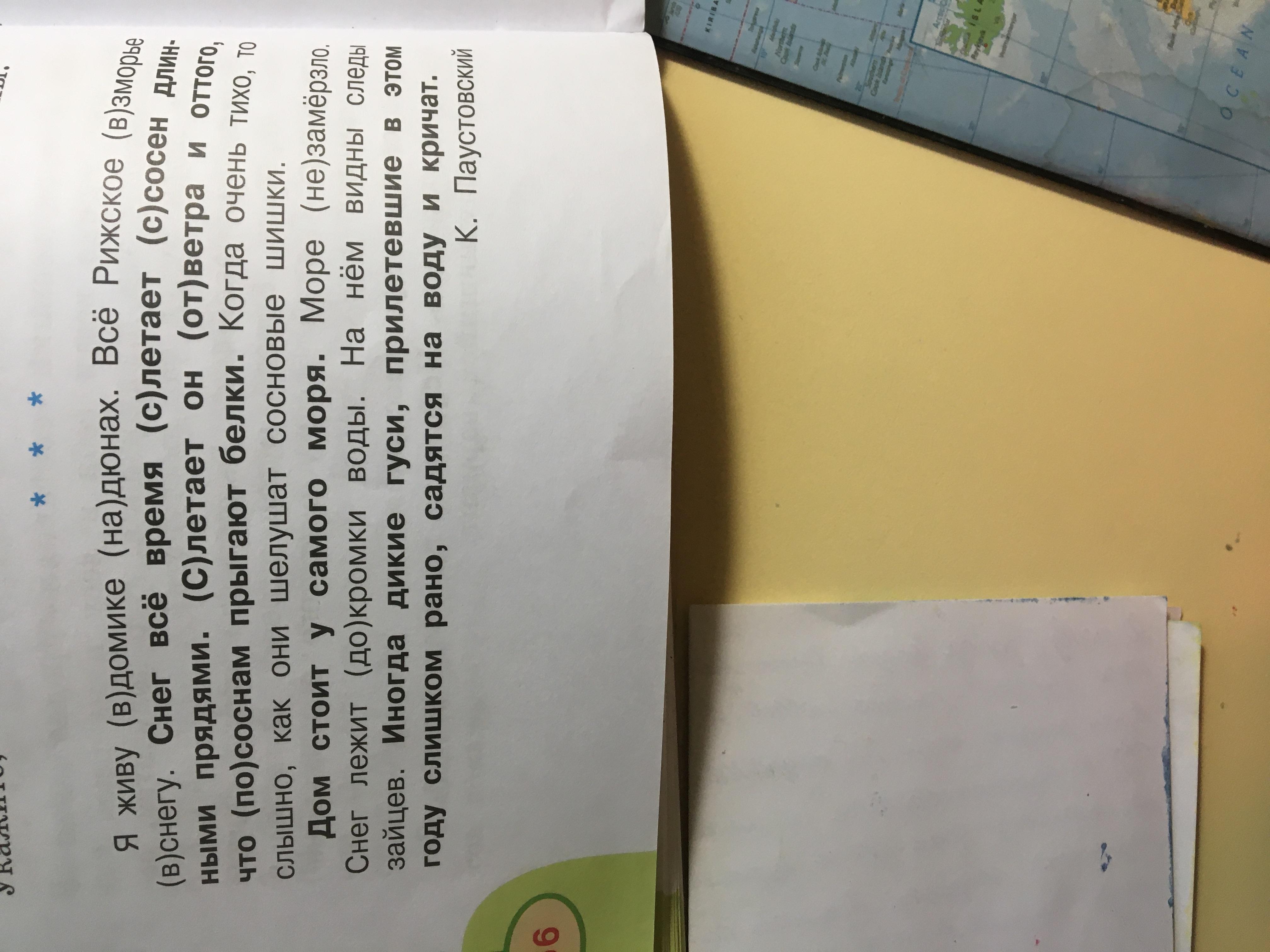 ну, списываешь текст, раскрывая скобки вот так: в домике, на дюнах, взморье, в снегу, слетает, с сосен, слетает, от ветра, по соснам, не замерзло, до кромки.