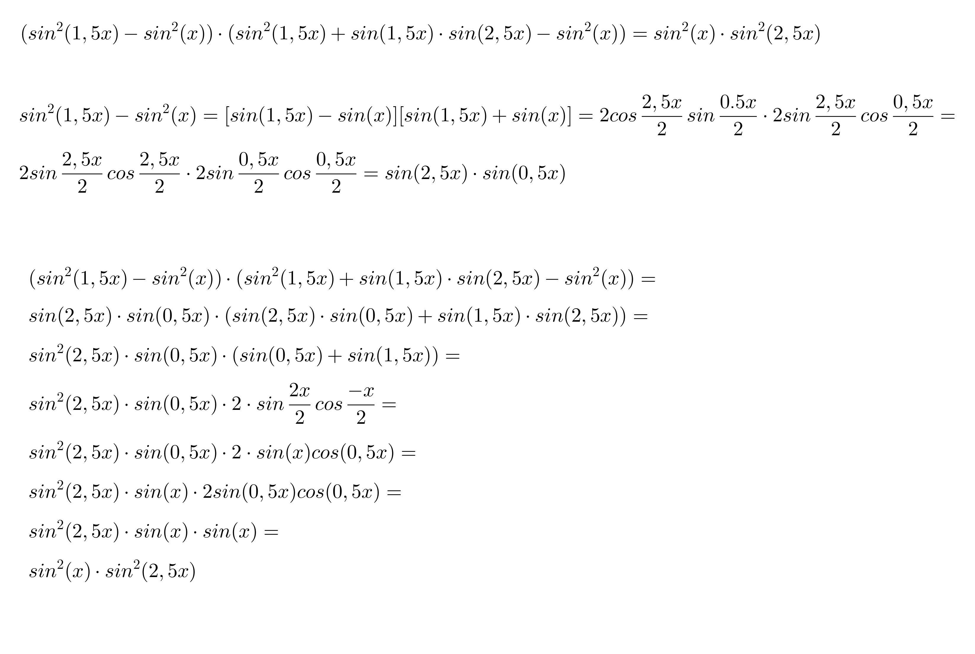 ДАЮ 100 БАЛЛОВ! Докажите тождество sin^2(1.5x)-sin^2(x))*(sin^2(1.5x)+sin(1.5x)*sin(2.5x)-sin^2(x))=sin^2(x)*sin^2(2.5x)