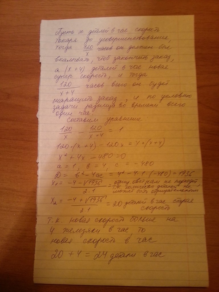 Это нерешаемо : Токарь должен был обработать 120 деталей к определённому сроку. Усовершенствовав резец, он стал обрабатывать в час на 4 детали больше и потому выполнил задание на 1 ч раньше срока. Сколько деталей в час стал изготовлять токарь после того, как он усовершенствовал резец?
