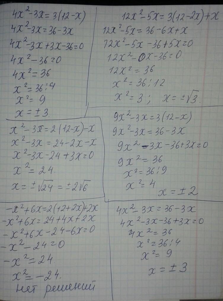 2) 12х^2 – 5х = 3(12 – 2x) +x;