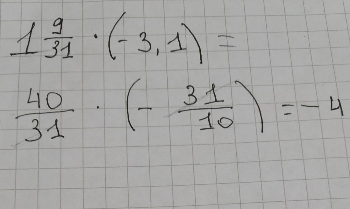 1целая 9/31*(-3.1)= 40/31*(-3целых 1/10) = 40/31*(-31/10)=4/1*(-1/1)=-4/1=-4