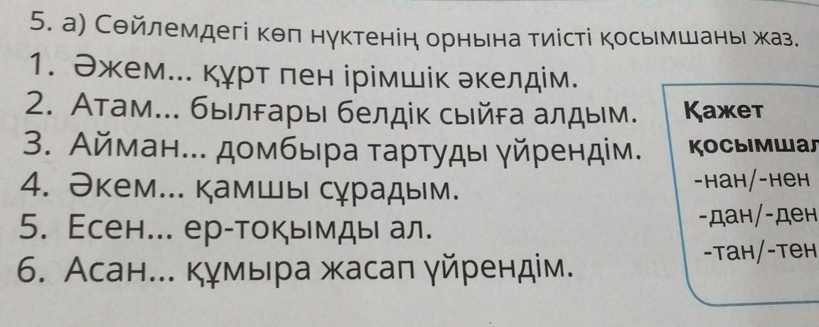 1. Әжеме құрт пен ірімшік әкелдім. 2. Атама былғары белдік сыйға алдым. 3. Айманнан домбыра тартуды үйрендім. 4. Әкемнен қамшы сұрадым. 5. Есеннен ер-тоқымды ал.6. Асаннан құмыра жасап үйрендім
