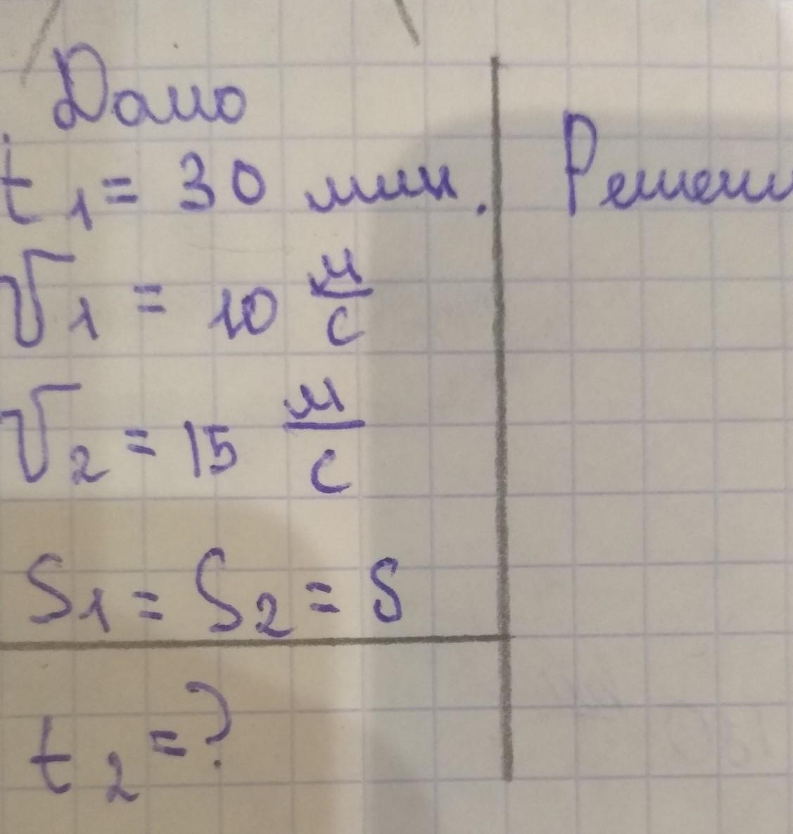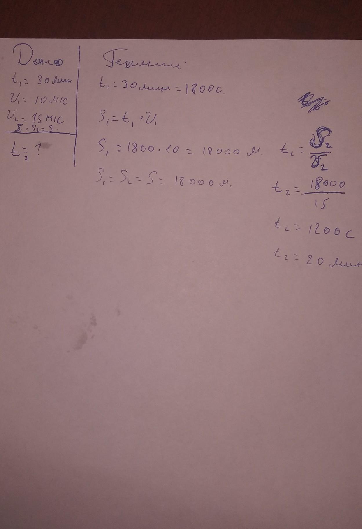 Далее, т.к. S общая, находим t2 : t2 = S/v2 =18000 / 15 = 1200 (ceк) что равно 20 минутам
